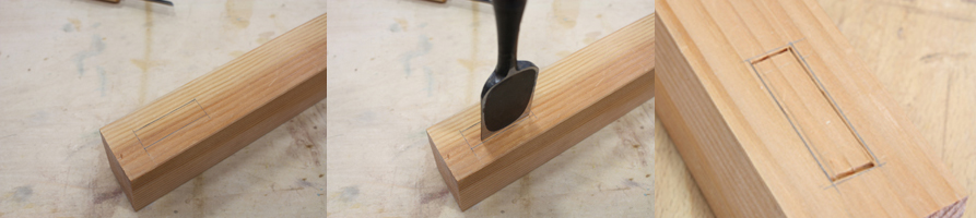 ※彫る位置の墨付けが終わったら、墨付け線の2㎜位、内側を鑿の刃先で、彫り線を刻む。