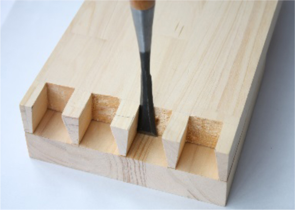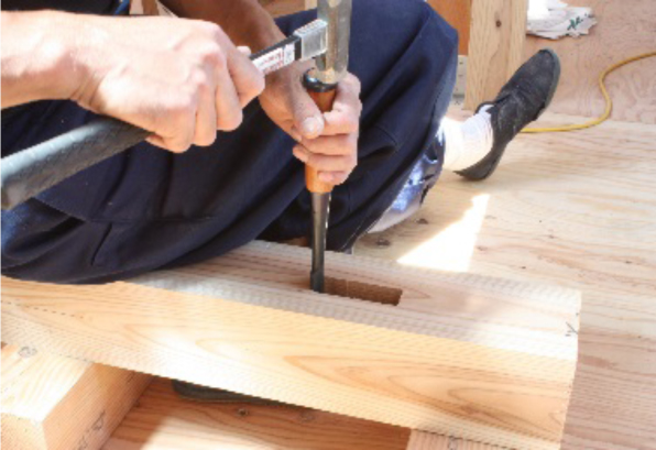 彫り屑が溜まったら、縦にノミを打ち込み木屑を打ち取る。